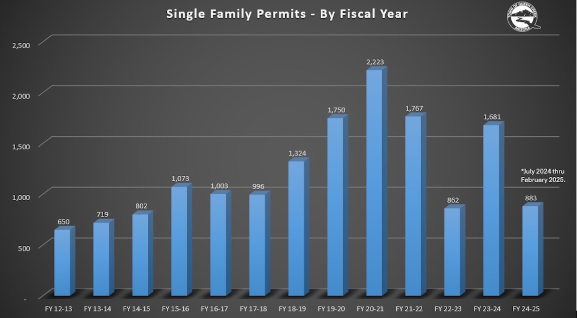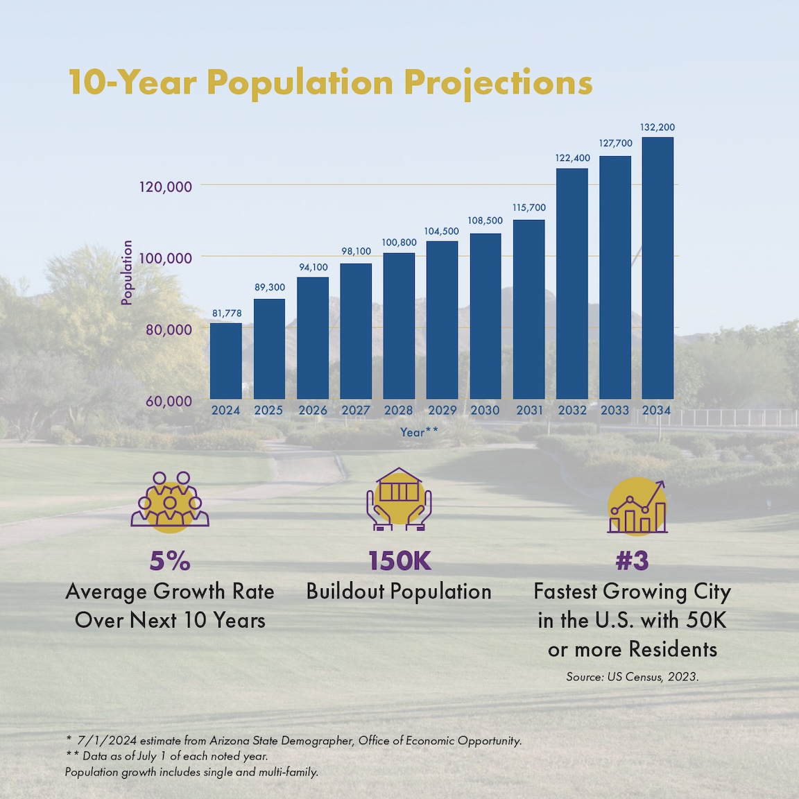 Queen Creek is growing, with a current population of 89,300, and anticipating a 54% population increase in 10 years. The Town projects to have 150,000 residents at build out.